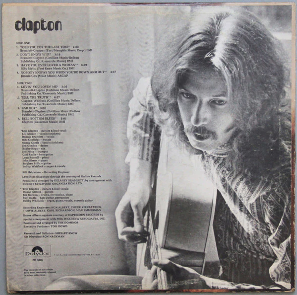[l717172 pressing indicated by "66" etched in run-outs and 2.75" press ring. Noted on back cover: "The contents of this album have been previously released in other collections." Title of track A4 on label erroneously reads "Nobody Knows When You're Down And Out", but this should read "Nobody Knows You When You're Down And Out". Tracks A3, A4, B2 and B4 were originally released on [m76678 and should be credited to [a110252, rather than just Eric Clapton. Clear Clapton hype sticker with red lettering. Leon Russell appears through the courtesy of [l44717 Duane Allman appears through courtesy of [l31572 by special arrangement with [a3080457 Tracks A1, A2, B1 & B3 by arrangement with Robert Stigwood Organization, Ltd. Publishers: A1: East/Memphis Music Corp. BMI A2, B1 to B3: Cotillion Music/Delbon Publishing Co./Casserole Music BMI A3: Fort Knox Music Co. BMI A4: MCA Music ASCAP B4: Casserole Music BMI