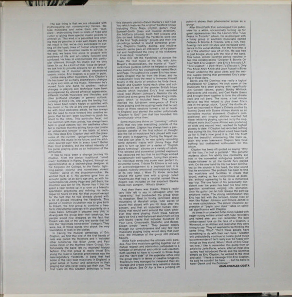 "PR" in label matrix denotes a [l130920 pressing. This is the original version with 1841 Broadway address on label. Warner logo (on labels) version can be found here [r1662954) Other pressings: MO = Monarch Record Mfg. Co. [r3971310 RI = PRC Recording Company, Richmond, IN [r5785611 "In this two record set, Side One is back with Side Three and Side Two is backed with Side Four" On front cover: A Product of Polydor-England A1: from Epic EG 30135 "The Yardbirds," courtesy of Giorgio Gomelsky. A2: from London PS 492 "Blues Breakers," courtesy of London Records. A3: Courtesy of RCA Records. A4: from Elektra EKL 4002 "What's Shakin'," courtesy of Elektra Records. A5: from Atco SD 33-232 "Cream: Disraeli Gears," by arrangement with The Robert Stigwood Organization, Ltd. A6, B1: from Atco SD 2-700 "Cream: Wheels of Fire," by arrangement with The Robert Stigwood Organization, Ltd. 'Crossroads' recorded live at The Fillmore West, San Francisco, California. B2: from Atco SD 7001 "Cream: Goodbye," by arrangement with The Robert Stigwood Organization, Ltd. C1: from Atco SD 33-304 "Blind Faith," by arrangement with Robert Stigwood & Chris Blackwell. Steve Winwood appears through the courtesy of United Artists Records. C2, C3: from Atco SD 33-326 "Delaney & Bonnie & Friends on Tour with Eric Clapton." Recorded live in England. C4: from Atco SD 33-383 "King Curtis: Get Ready." Recorded at Sunset Sound Studios, Los Angeles, California. C5: from Atco SD-329 "Eric Clapton," by arrangement with The Robert Stigwood Organization, Ltd. Recorded at Village Recorders, West Los Angeles, California. Leon Russell appears through the courtesy of Shelter Records. D1: from Atco single 6780, by arrangement with The Robert Stigwood Organization, Ltd. D2: Previously unreleased D3: from Atco SD 2-704 "Derek and the Dominos: Layla". Recorded at Atlantic South-Criteria Sound Studios, Miami, Florida. Released in the U.S.A. by special arrangement with Polydor Records, Ltd., London â„— 1972 Atlantic Recording Corporation Mfg. by Atlantic Recording Corp., 1841 Broadway, New York, N.Y. Inner (LP) sleeve printed by Queens Litho in U.S.A. Publishers: A1 - Conrad, BMI A2 - Son-lo, BMI A3 - Nice Songs, BMI A4 - Nina, BMI A5, D3 - Casserole, BMI A6 - Noma, BMI B1 - Arc, BMI B2 - Casserole-Harrisongs, BMI C1, C2 - Irving, BMI C3 - Nelchell, BMI C4 - Kilynn, BMI C5 - Skyhill-Casserole, BMI D1, D2 - Casserole-Delbon-Cotillion, BMI